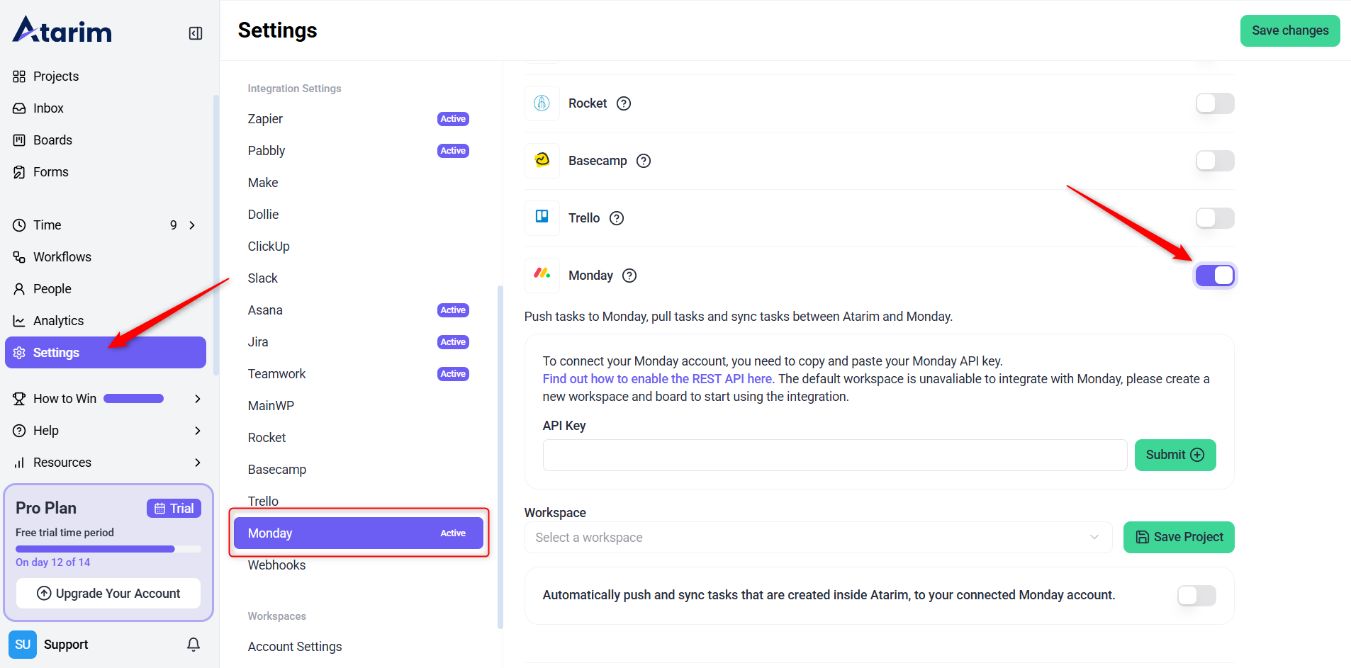 - Return to the Monday integration section in Atarim.