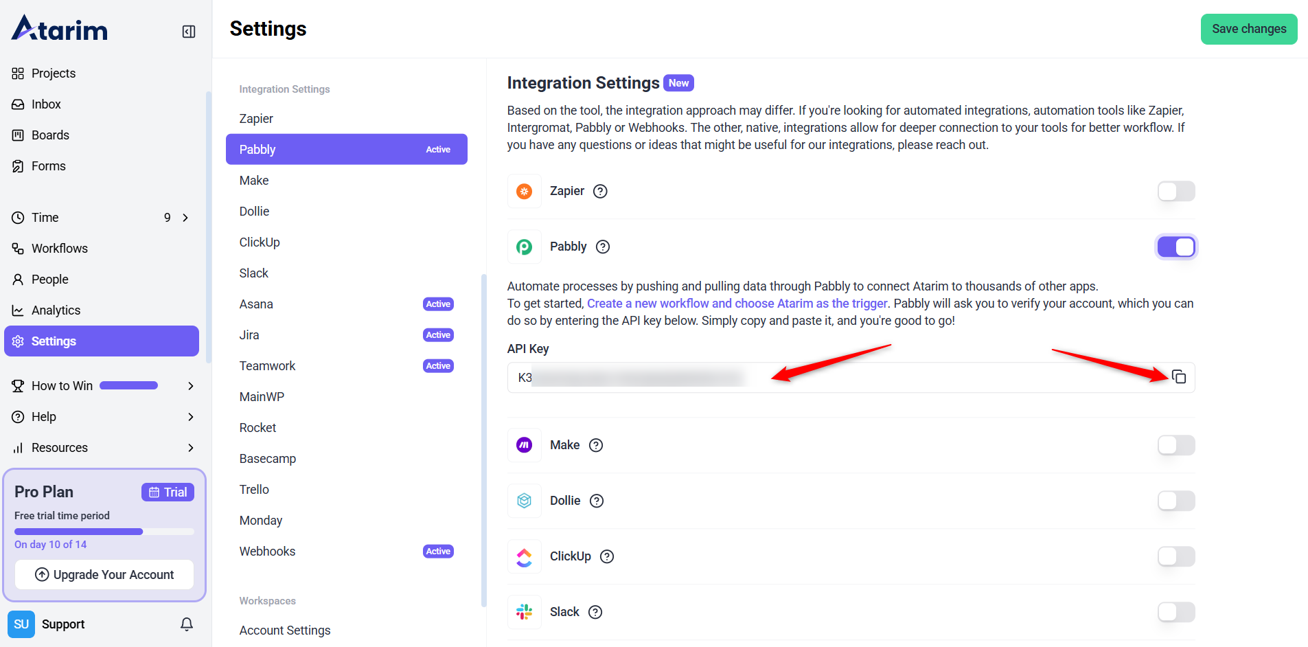 Before connecting to Pabbly, you need to enable the integration and retrieve your API key from Atarim.