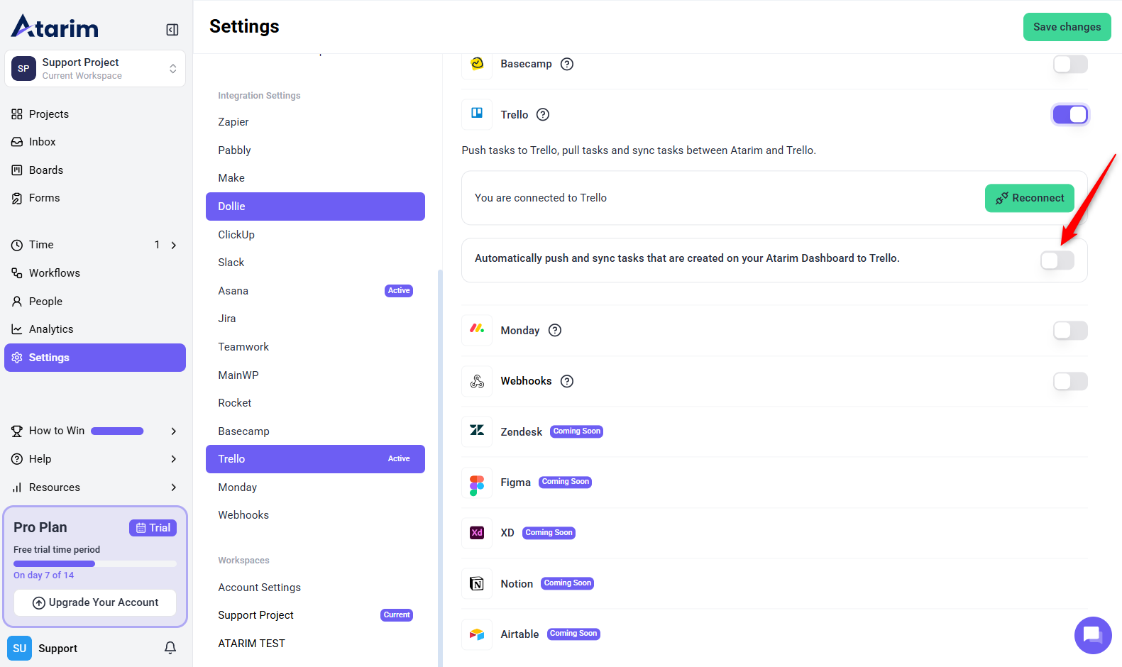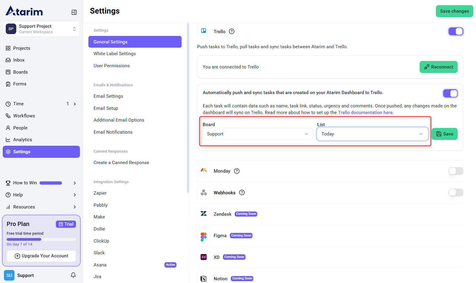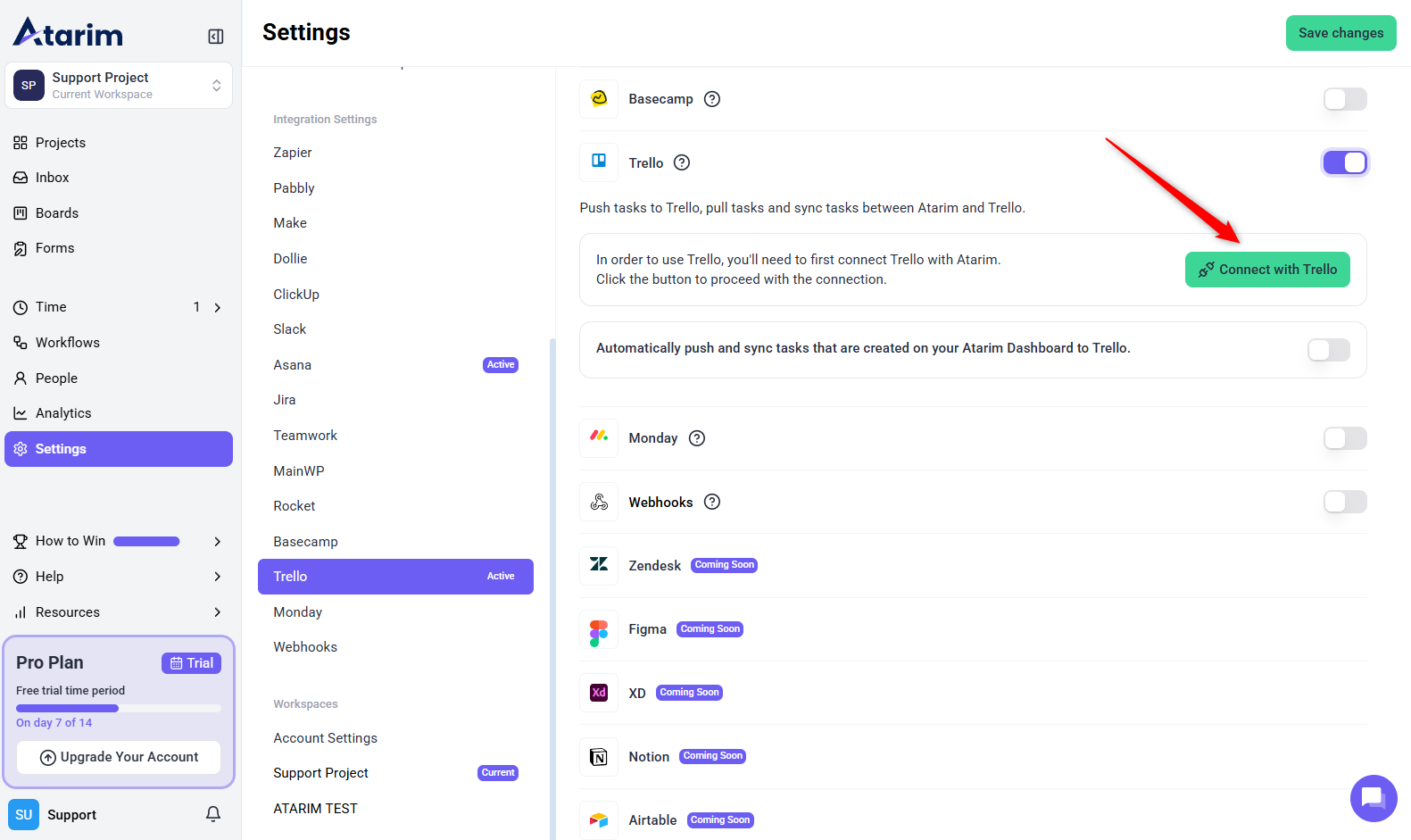 The first step is enabling Trello integration within your Atarim settings.