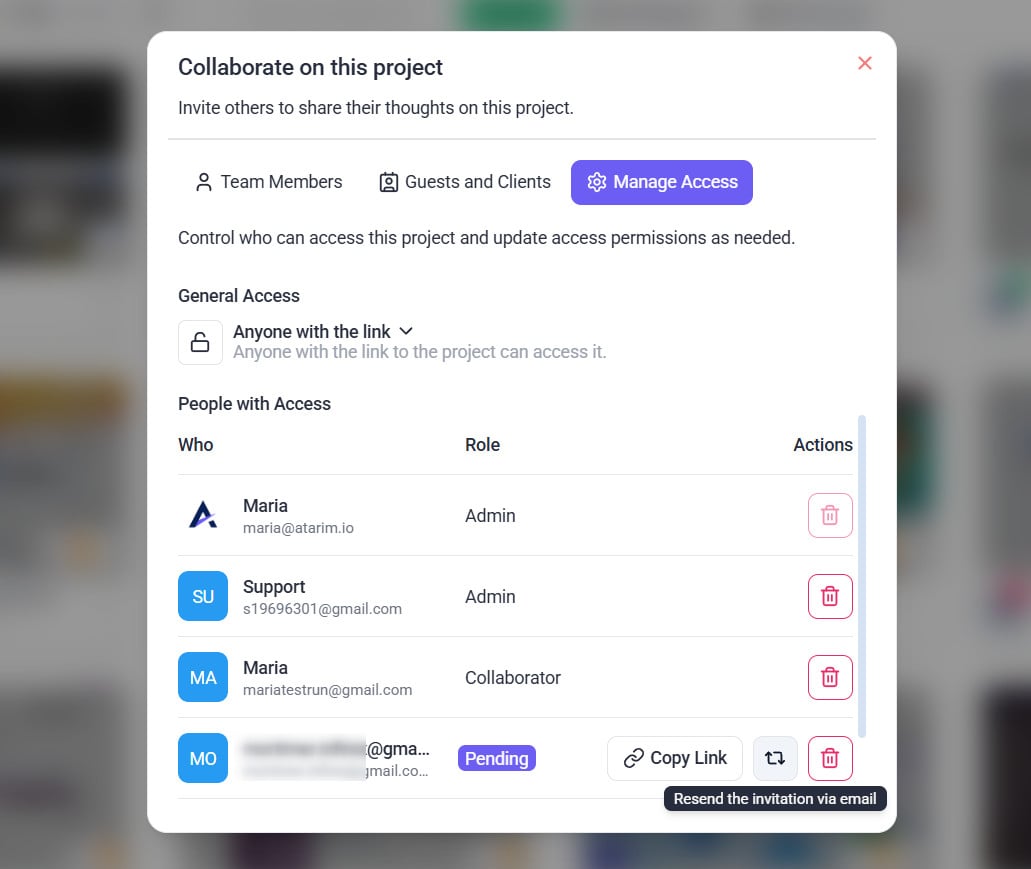 Tip: Assign roles based on responsibilities to ensure the right permissions for each member. Use Administrator for those overseeing the project and Contributor for those involved in task execution.