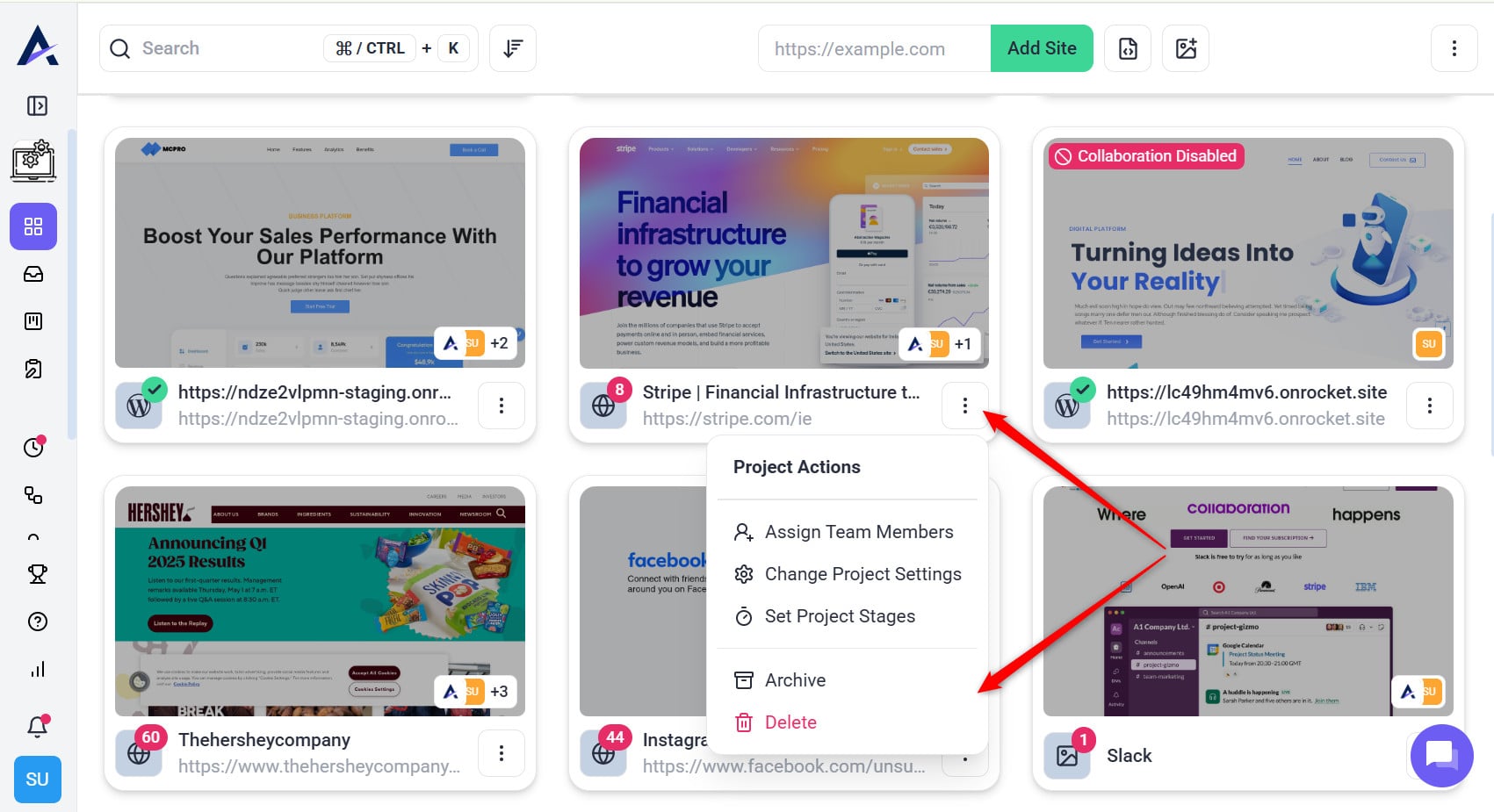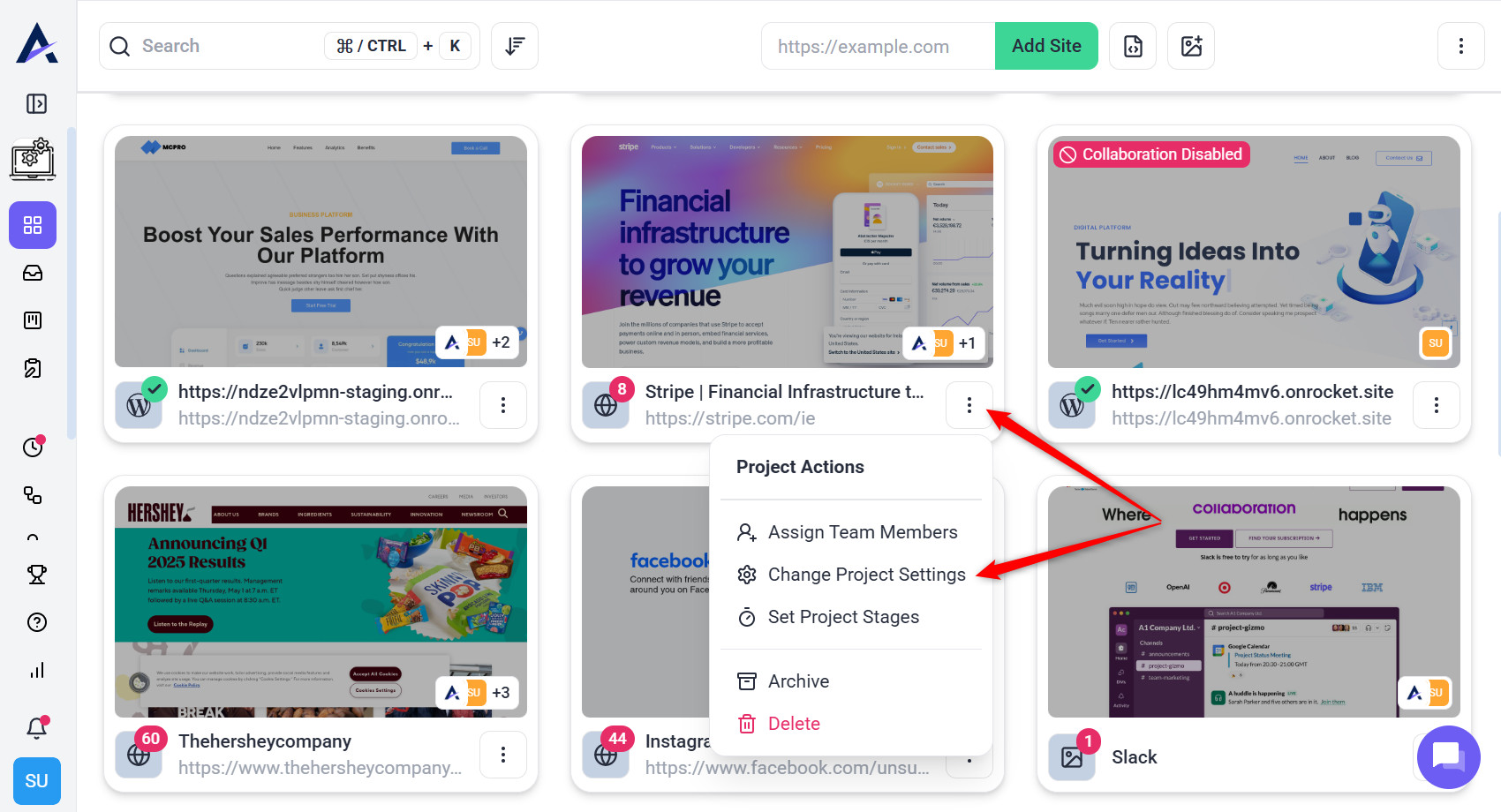 1. Hover over the project you want to modify and click on the three vertical dots (project settings icon) to open the project settings.