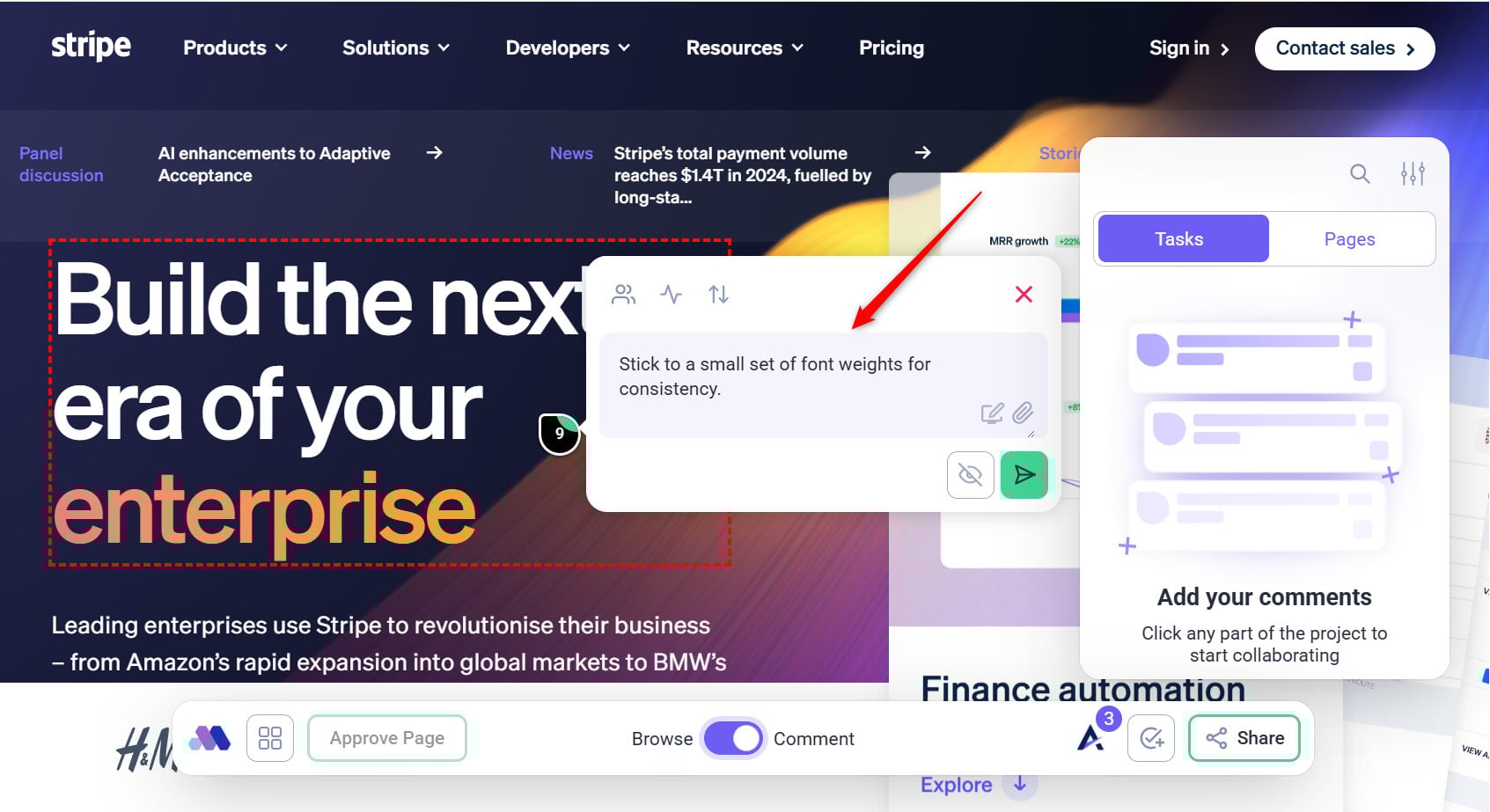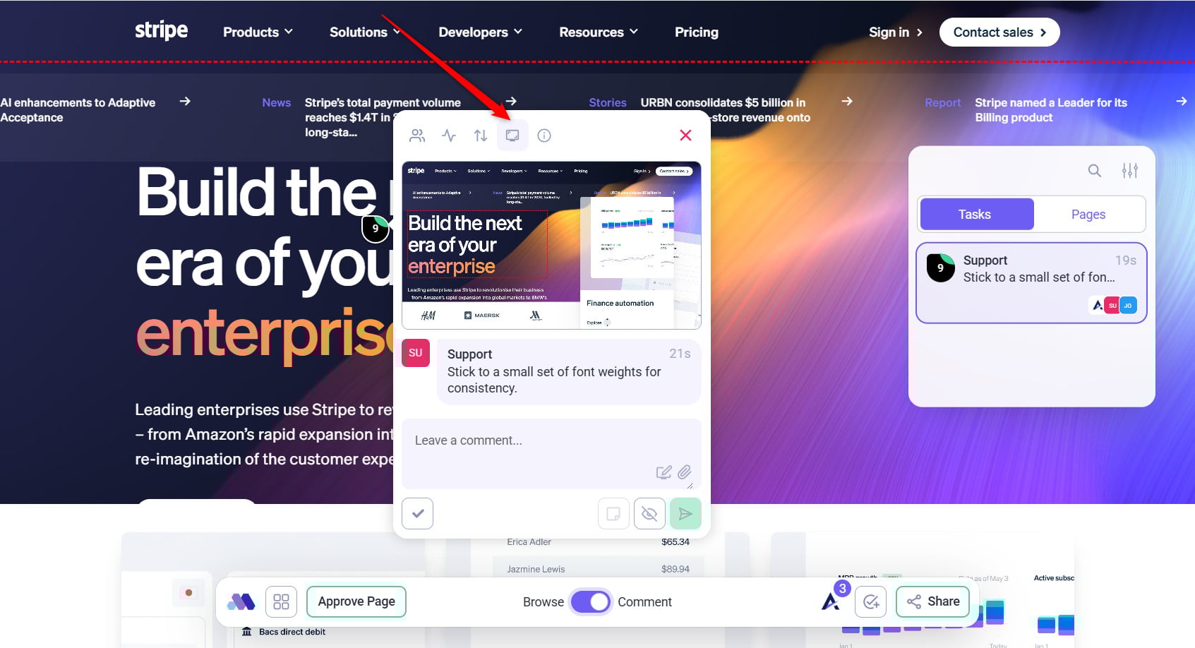• Visual Collaboration Tools: Developers can view feedback as tasks pinned to specific areas of a design or webpage.