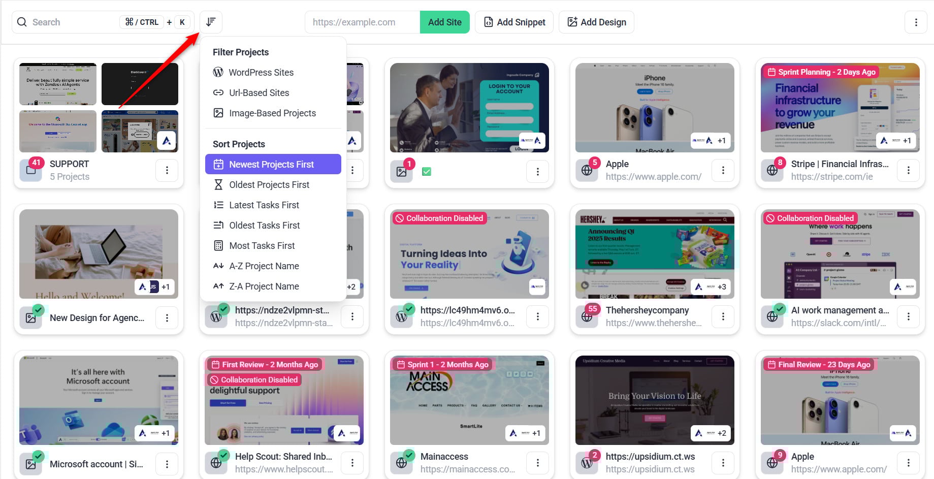 Manage and view all your projects in one place with filtering and sorting options.